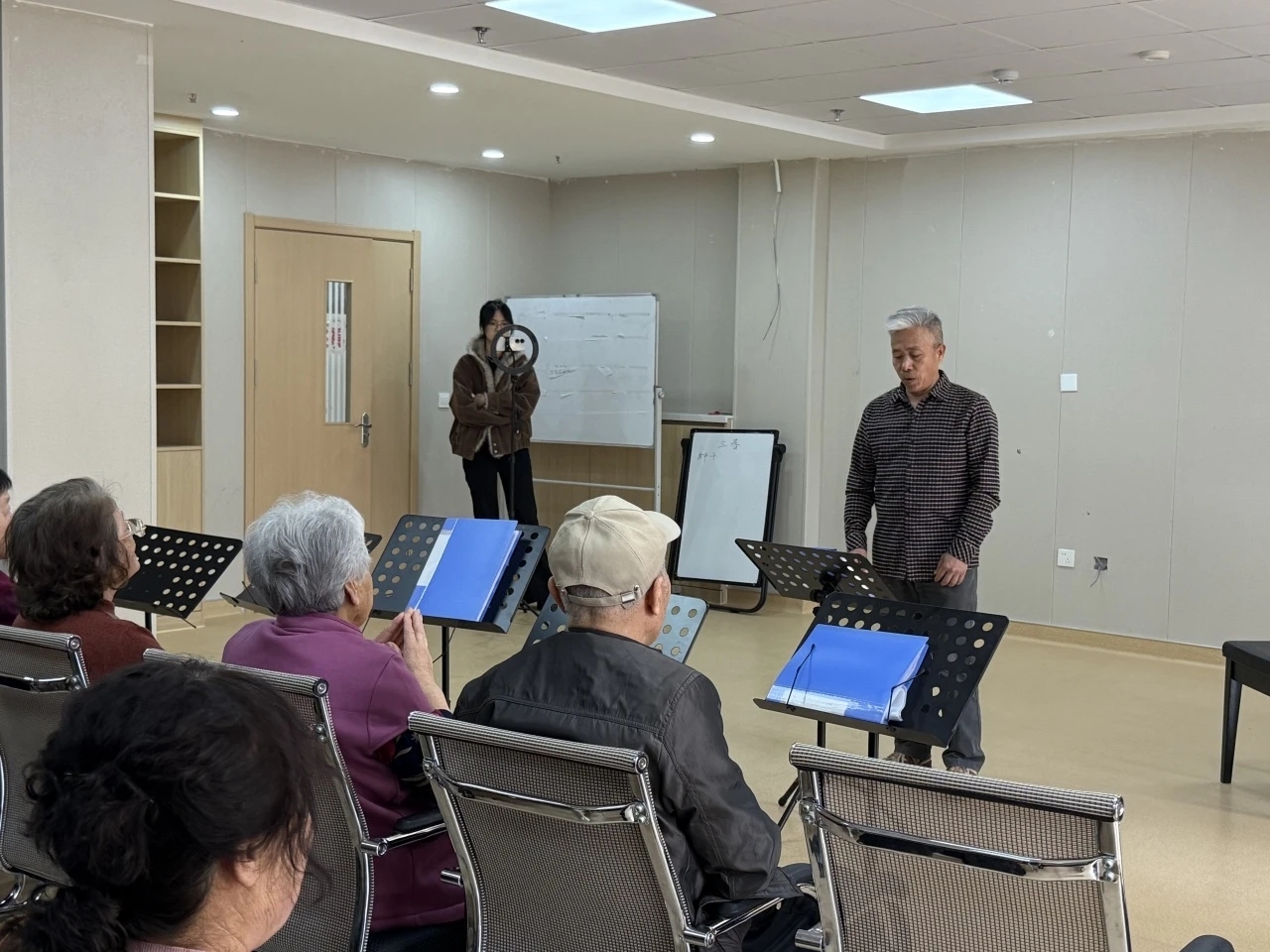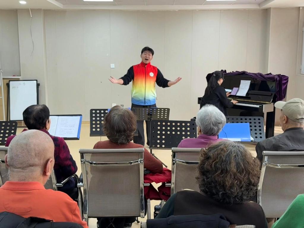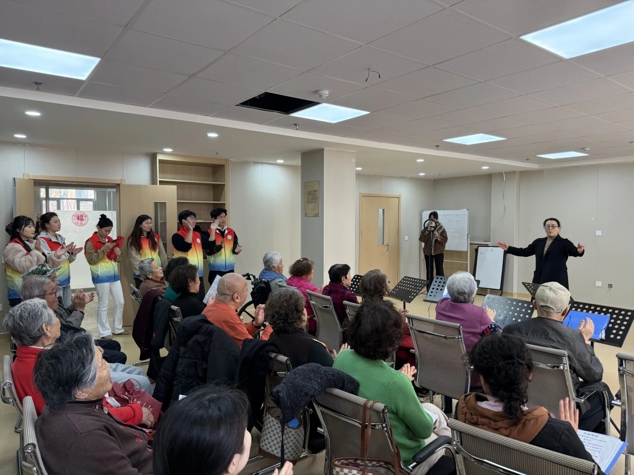参观结束后,师生与社区老人开展了歌唱互动环节。音乐表演专业教师率先登台,演唱经典歌曲;随后学生代表依次献唱,展现专业风貌;最后,全体师生与老人共同合唱经典曲目,以实际丰富社区老年人的精神文化生活。